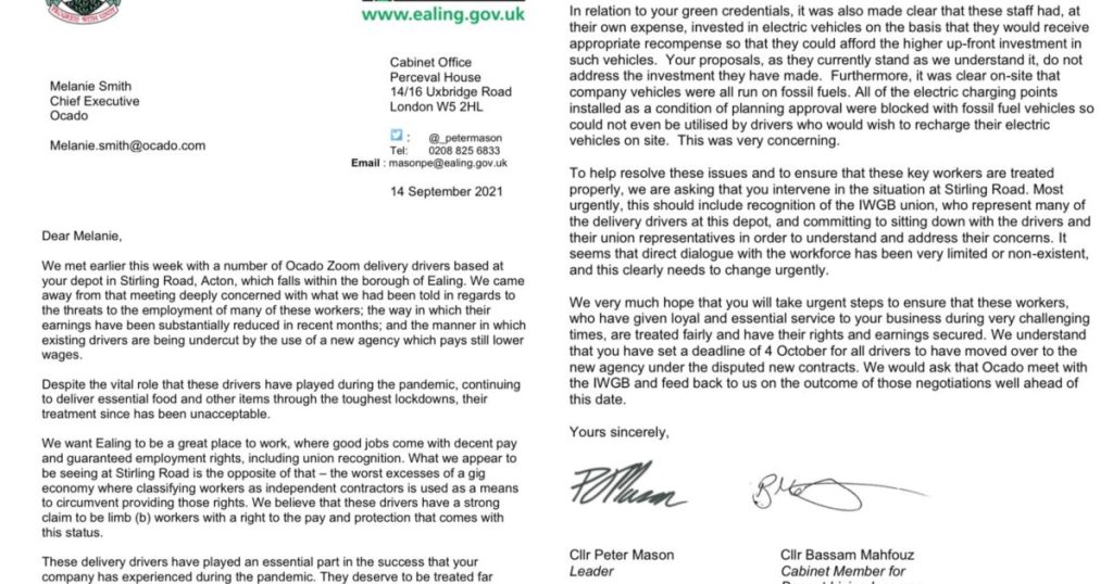 Letter to Ocado from Cllrs Mason and Mahfouz Councillors Peter Mason, Leader of the Council, and Bassam Mahfouz, Cabinet Member for Decent Living Incomes, have written to Ocado with their concerns about the treatment of workers at the Ocado depot in Stirling Road, Acton. After meeting delivery drivers – members of the Independent Workers Union […]